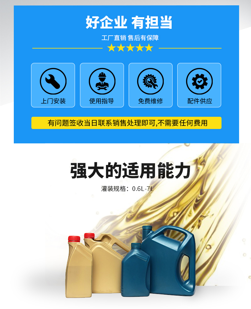 機器應用范圍:1-10升通用型號,機器采用流量計計量,觸摸屏控制,參數一鍵調整,方便快捷。可以灌裝各種油脂,油料。灌裝頭采用專用的油脂防滴漏灌裝頭,不滴漏。機器設定有快慢速技術,可以先快后慢,防止物料噴濺。保持生產車間干凈潔凈。