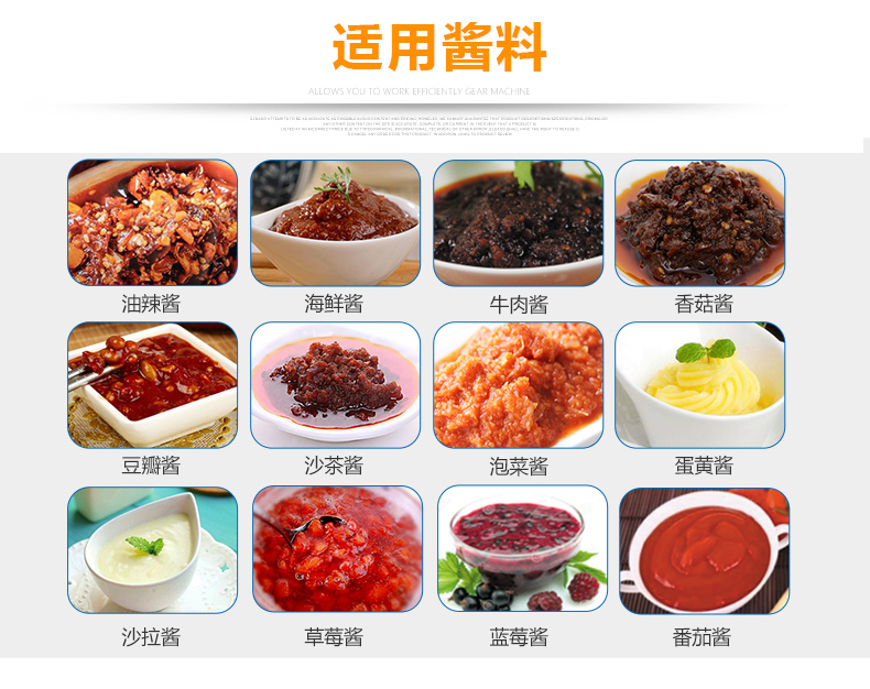 備注:果醬、醬料、花生醬、番茄醬、醬料、豆瓣醬、辣椒醬、蝦醬、蘋果醬、沙拉醬、魚子醬、辣醬均可以灌裝。